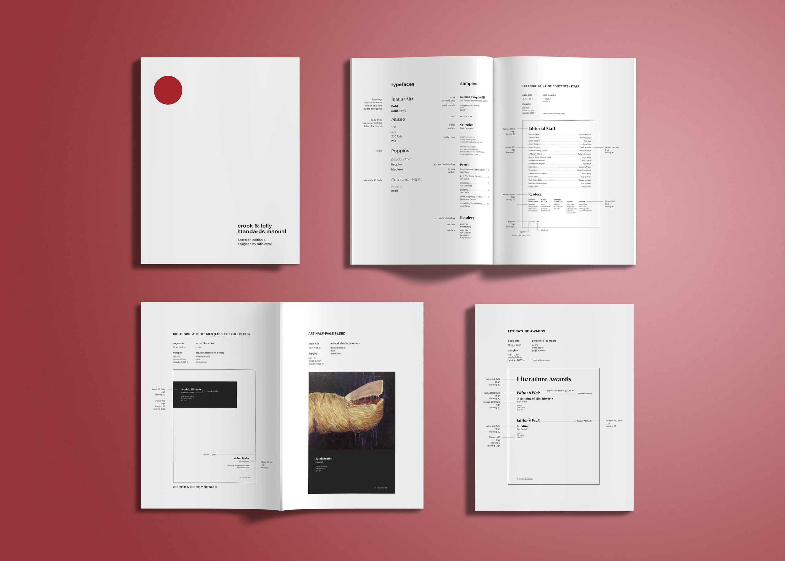 The Crook & Folly Standards Manual ensures brand cohesion for future editions, with examples of each kind of page layout, typeface options, and details from folio location to the kerning of copy text.